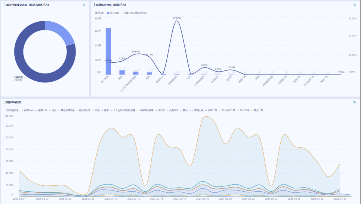 - 优化路径:通过九数云BI自动化流量分析,聚焦高转化渠道,淘汰低效投放,每场直播流量成本下降15%。